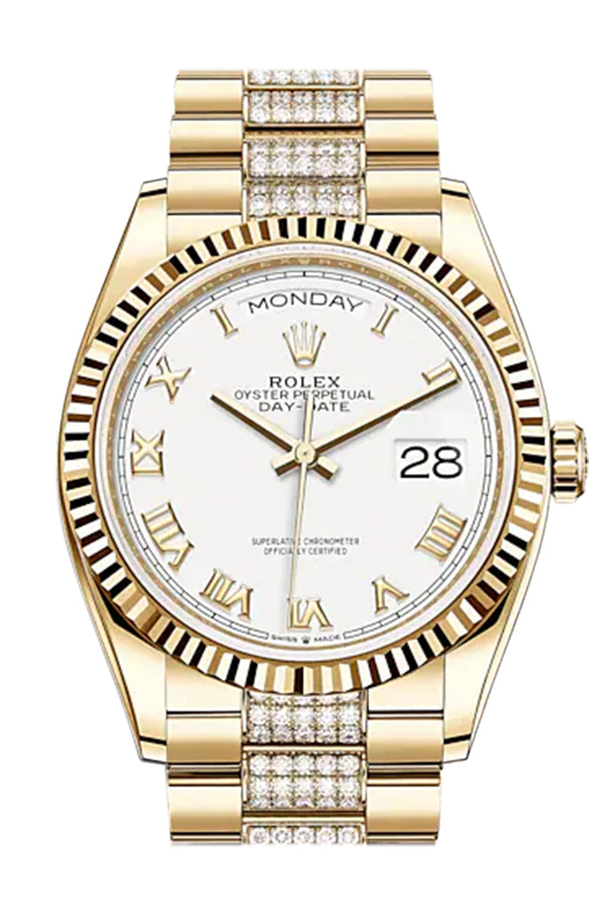ROLEX Day-Date 36 White Roman Dial 18K Yellow Gold Watch - Ref # Diamond set president Bracelet 128238