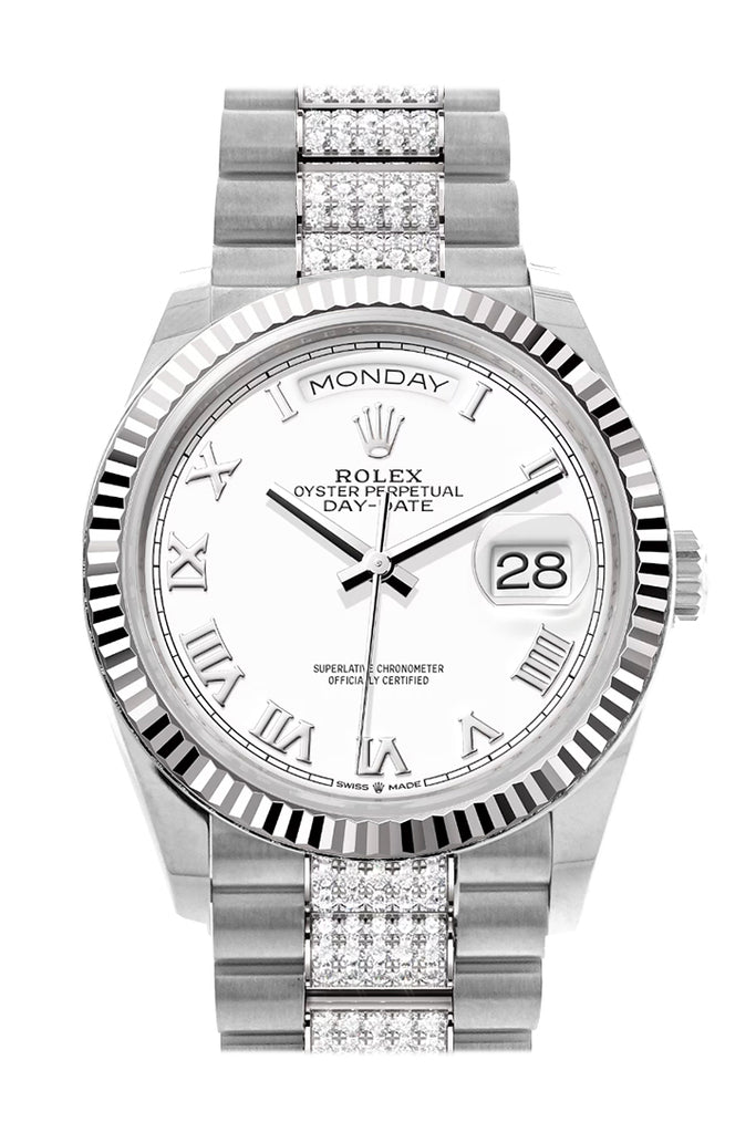 Rolex Day-Date 36 White Dial Fluted Bezel White Gold Diamond President Watch - Ref # 128239