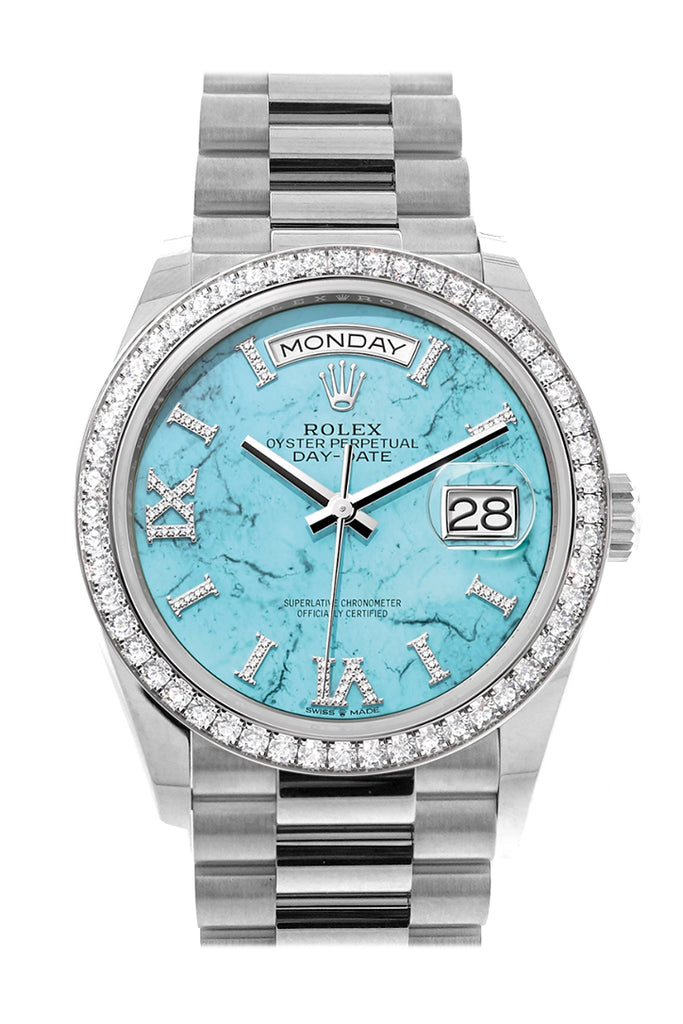 Rolex Day-Date 36 Turquoise Diamond Dial Diamond Bezel White Gold Diamond President Watch - Ref # 128349RBR