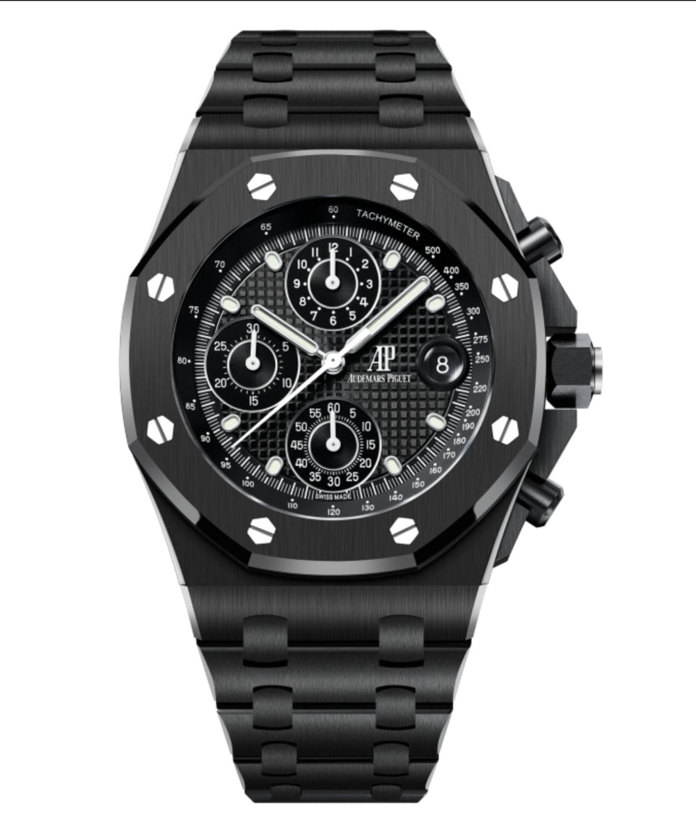 The aesthetic of this 43 mm black ceramic Royal Oak Offshore Selfwinding limited edition is...