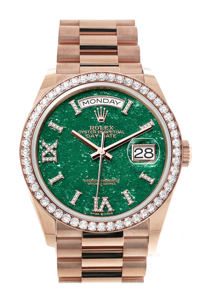 Rolex Day-Date 36 Green Aventurine Dial Diamond Bezel 18K Everose Gold President Watch - Ref # 128345RBR