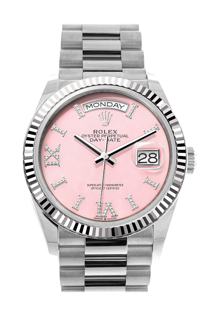 Rolex Day-Date 36 Pink Opal Diamond Dial Fluted Bezel White gold President Watch - Ref # 128239