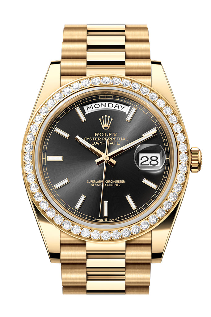 Yellow gold case with a 18kt yellow gold rolex president bracelet. Fixed bezel with diamond set. Bright Black dial with yellow gold hands and Index numeral hour markers. Dial Type: Analog. Date display at the 3 o'clock position. Rolex Calibre 3255 Automatic movement, based upon Rolex 3035, containing 31 Jewels, bitting at 28800 vph, and has a power reserve of approximately 70 hours. Scratch resistant sapphire crystal. Screw down crown. Solid case back. Round case shape, case size: 40 mm. Concealed folding crown clasp. Water resistant at 100 meters / 330 feet. Functions: date, day, hour, minute, second. Day-date 40 Series. Luxury watch style. Watch label: Swiss Made. Rolex Day-Date 40 Automatic Bright Black Dial Men's 18kt Yellow Gold President Men's Watch 228348 228348RBR 228348RBR-0043 New Release Model 2023