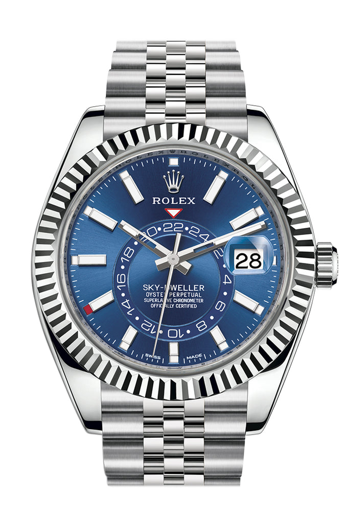 Silver-tone 18kt white gold and stainless steel case with a silver-tone 18kt white gold and stainless steel rolex jubilee bracelet. Fluted bezel. Blue dial with silver-tone hands and index hour markers. Dial Type: Analog. Luminescent hands and markers. Date display at the 3 o'clock position. One- 24 hours subdials. Rolex Calibre 9001 automatic movement. Scratch resistant sapphire crystal. Screw down crown. Solid case back. Case size: 42 mm. Round case shape. Water resistant at 100 meters / 330 feet. Functions: date, hour, minute, second. Luxury watch style. Watch label: Swiss Made. Rolex Sky-Dweller White Dial Automatic Mens Oyster Watch 326934. New Release Model 2021